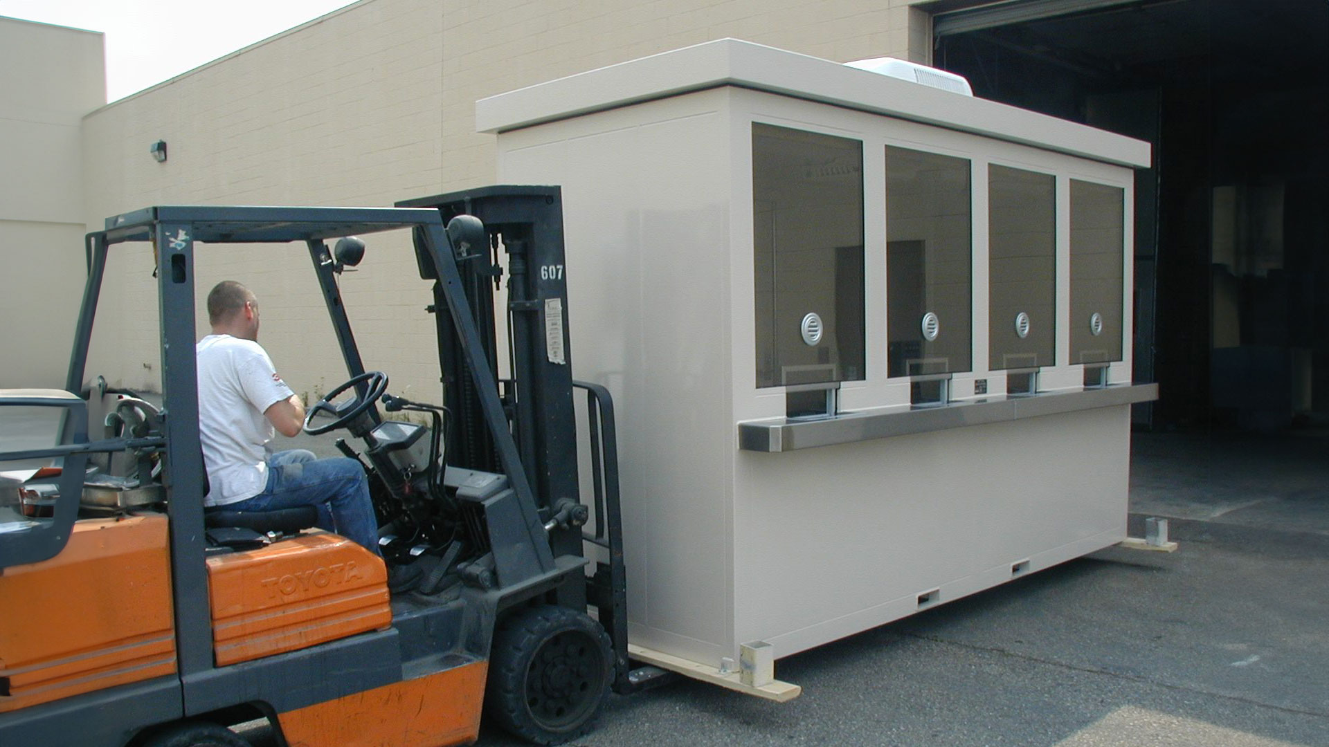The Little Buildings welded steel portable ticket booth offers exceptional versatility and ease of installation. One of its key advantages is the ability to transport the ticket booth fully assembled to your facility, ensuring a seamless setup process. A single unit portable ticket booth can be easily transported on a flatbed truck and effortlessly off-loaded with a forklift, then set into place. Larger ticket booths may require the use of a crane for off-loading, in which case lifting rings can be added to the roof of the booth for this purpose.